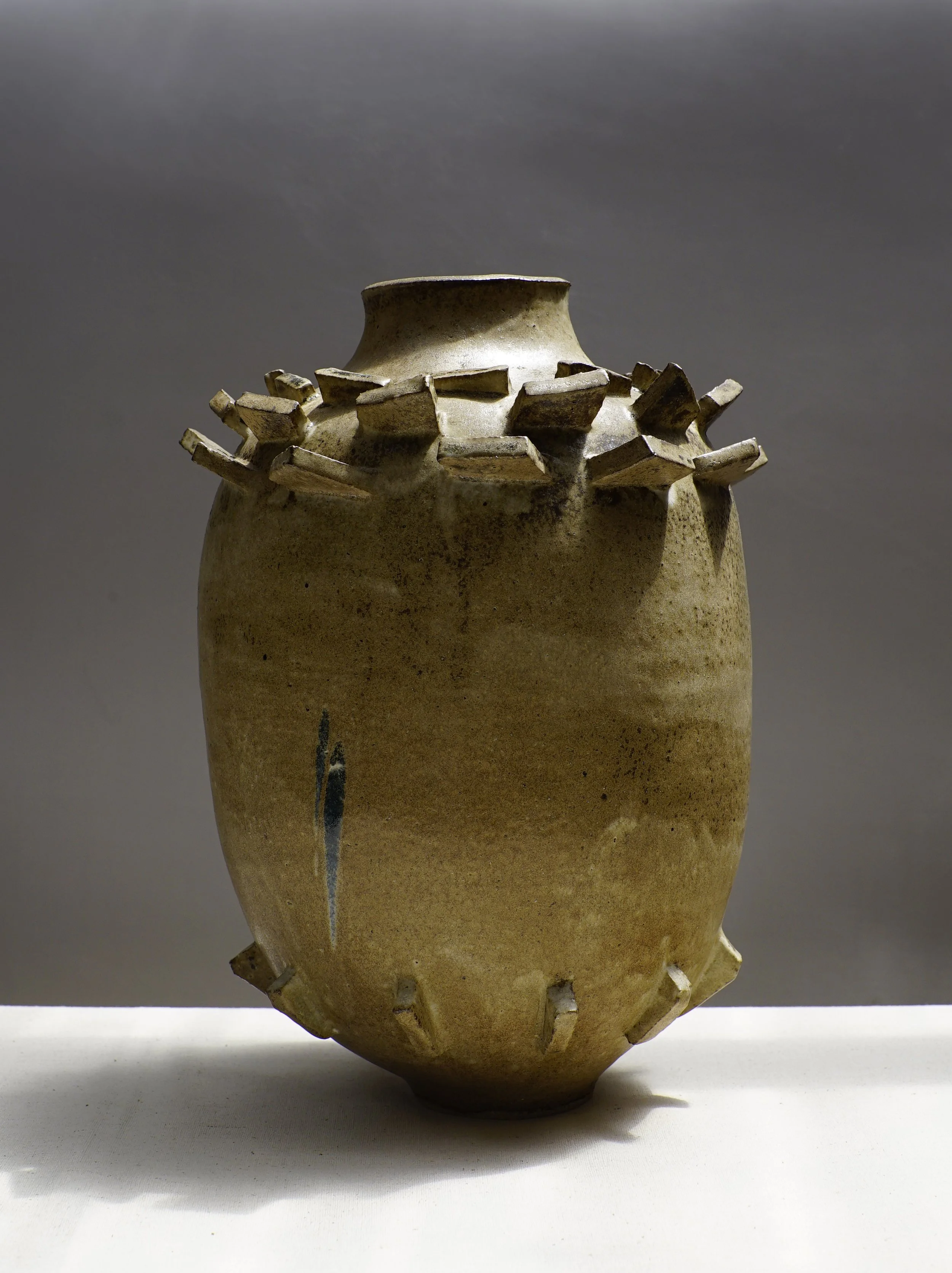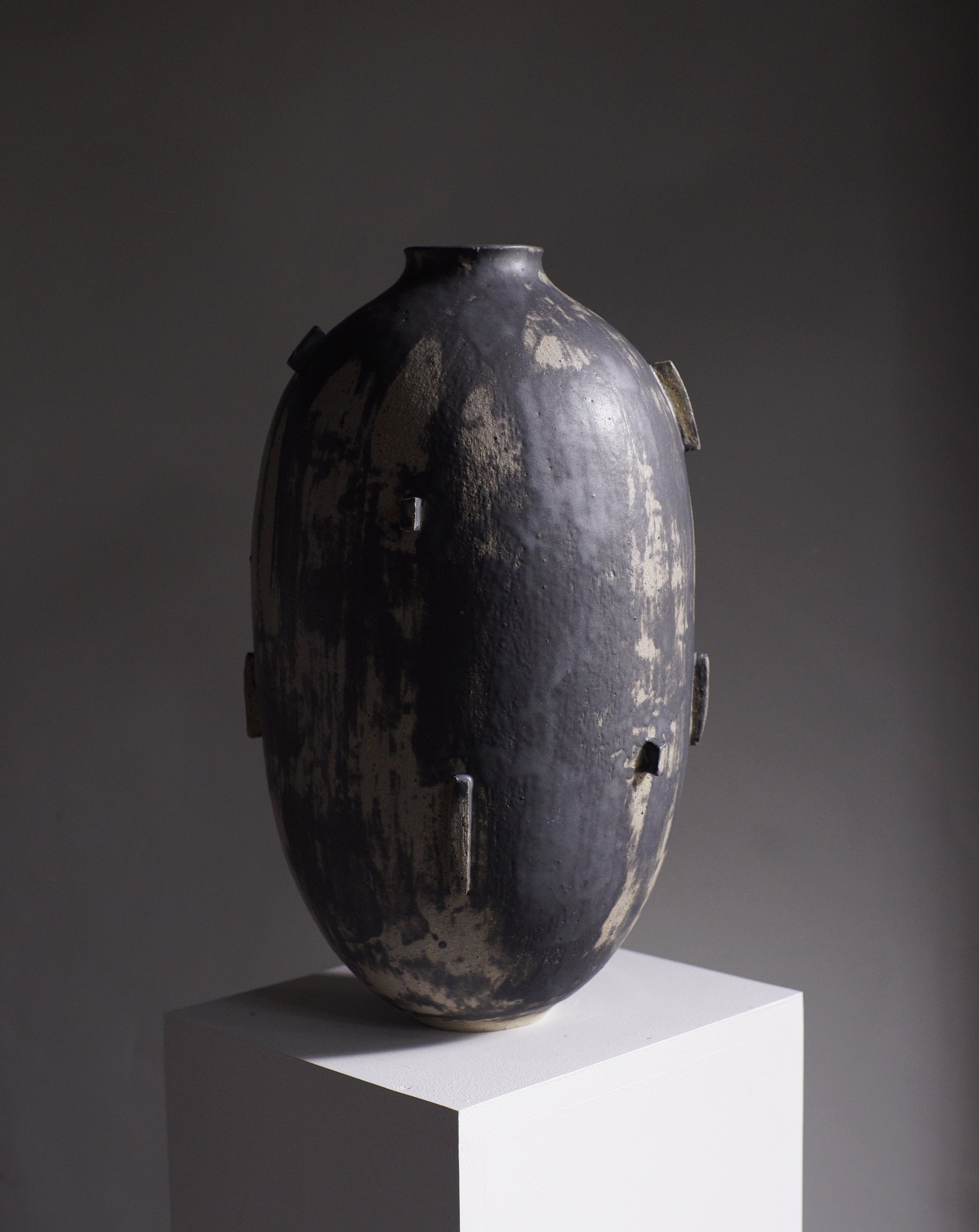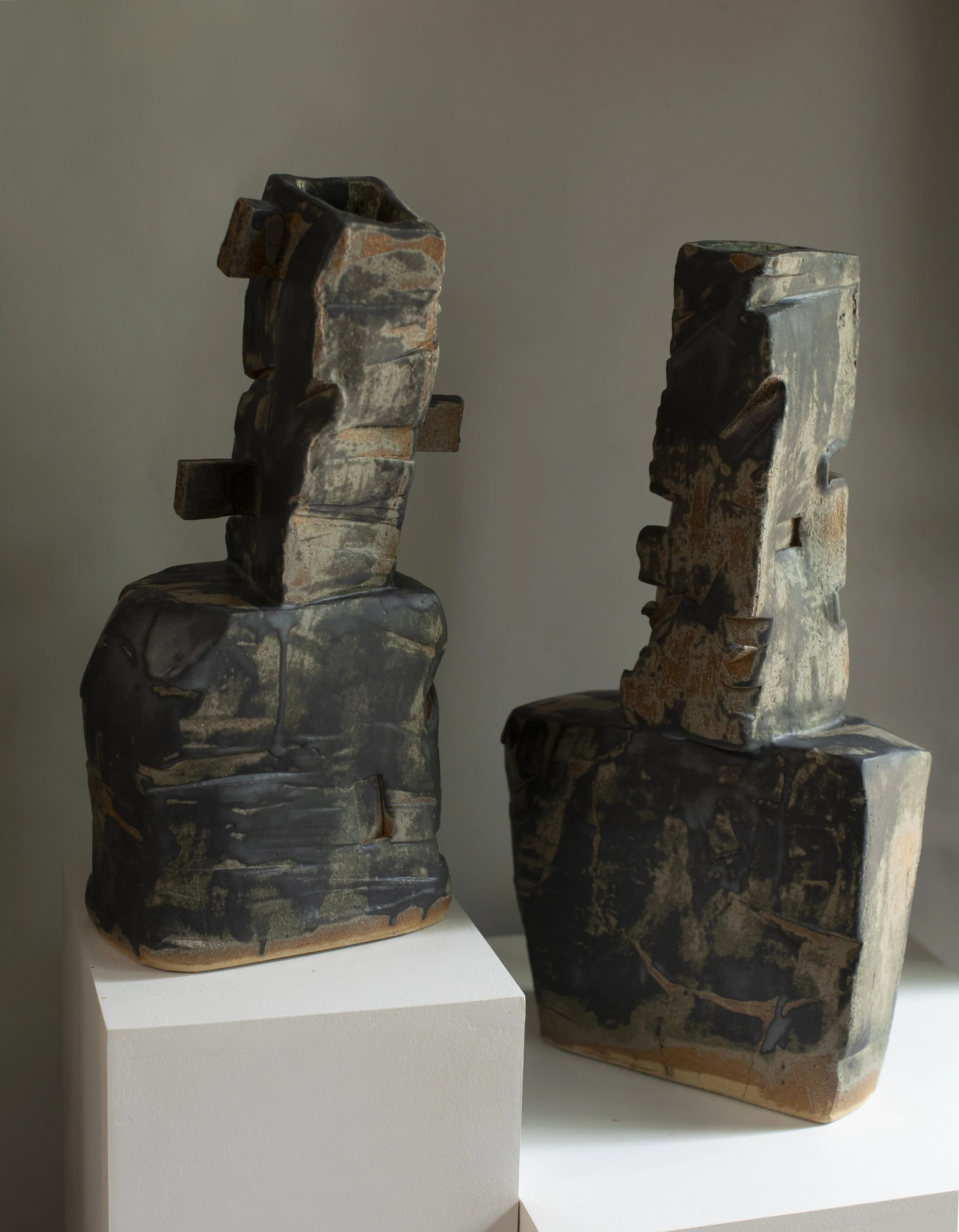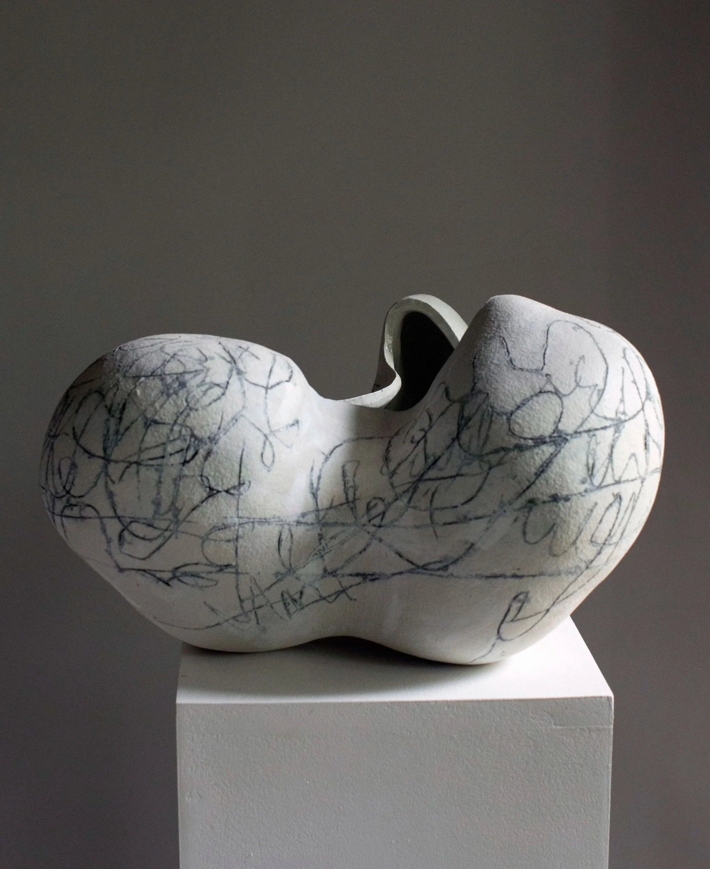 These hand-built vessels carry the weight of their accumulated presence. Each work speaks the memorial language of the body. The forms are build then enduring the impact, through scratching, slapping, leaving marks that the clay records.